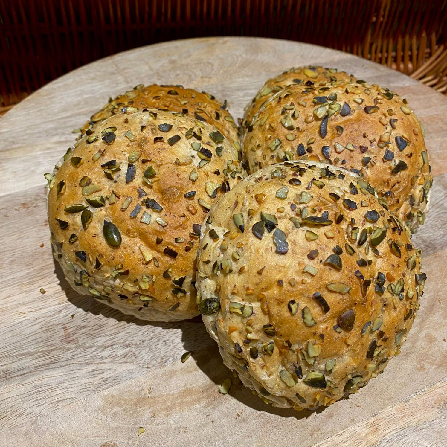 Een heerlijk product op basis van spelt en gevuld met een heerlijke vulling van cranberries, amandelen, suiker en rozijnen, gedecoreerd met zadenmix, die bij alle winkels van deze bakkers te verkrijgen is.